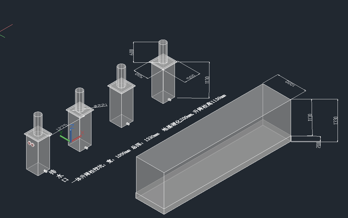 在槽的底部填200mm高的混泥土,水平面精確度要求高(升降柱機(jī)架底部,可以全部接觸底下混泥土的面部,從而整個機(jī)架都能受力),并在槽的低部中間位置處,留一條PVC60#用于排水。